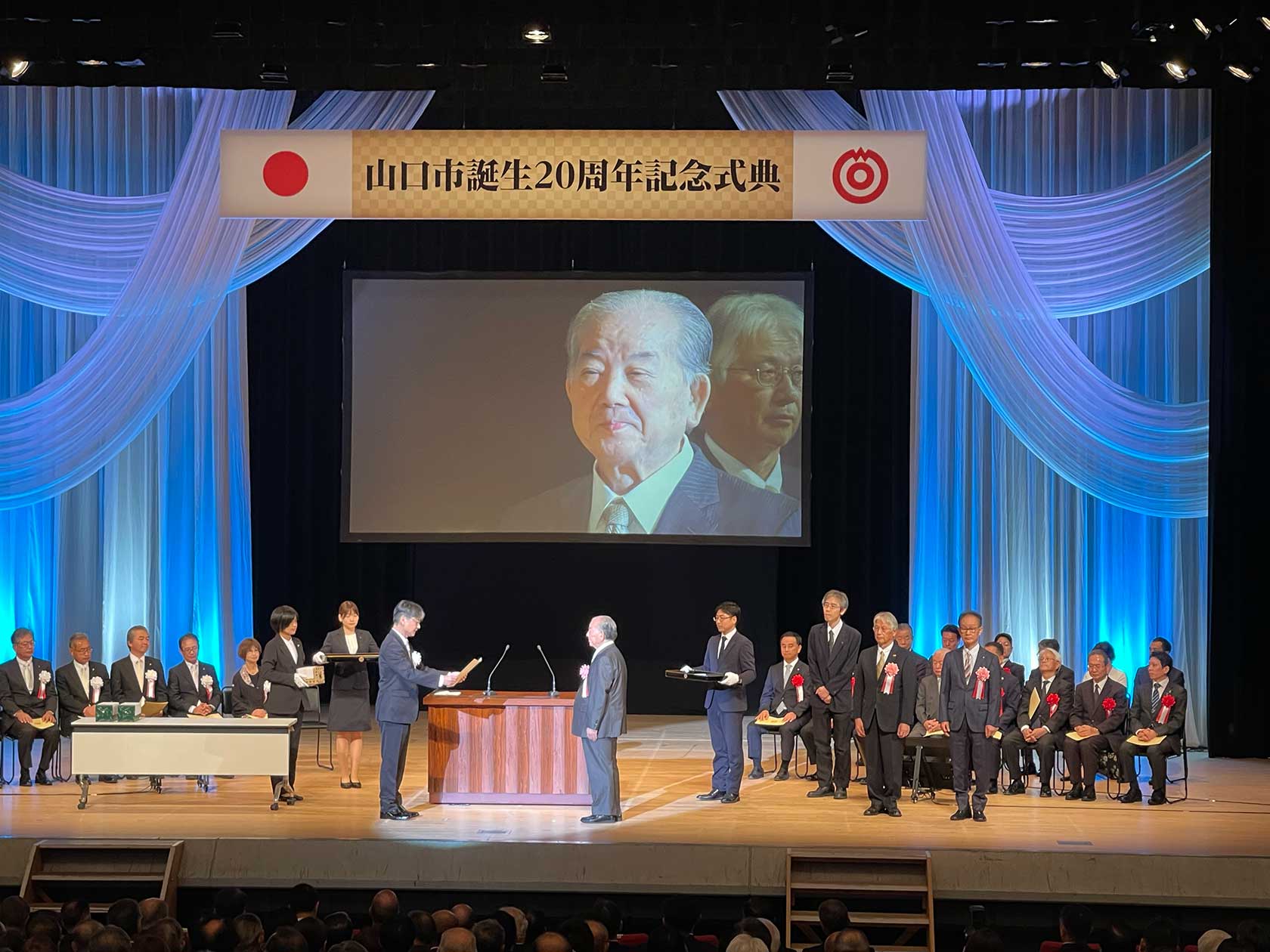 「平成の大合併」によって2005年10月に発足した山口市の誕生20周年を祝う式典が、10月4日に山口市民会館で開かれた。