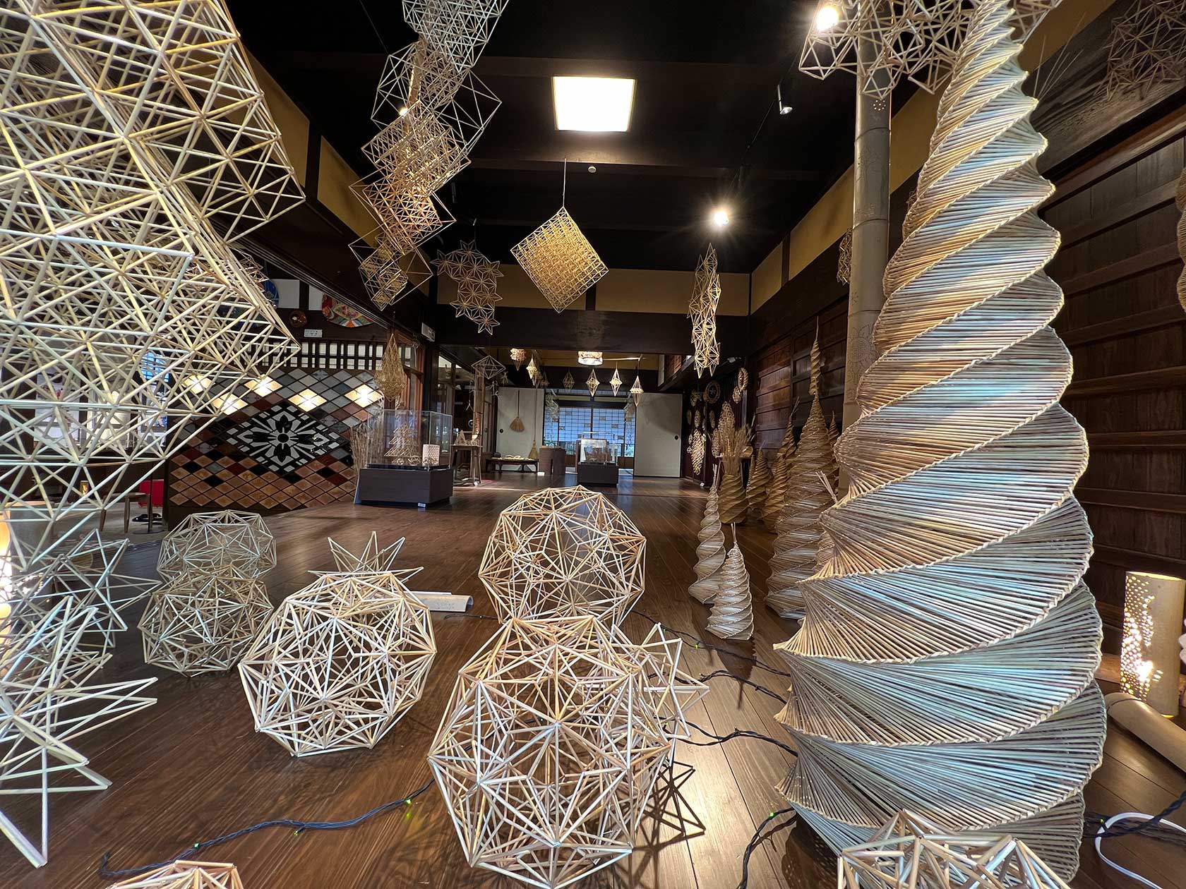 会場には、山口市名田島産の小麦藁で作られたヒンメリ(藁に糸を通して八面体に仕上げられた北欧の装飾品)や蛍かごなど、約150点が飾られている。「山口をクラフトでつなぐ活動」をしている「つむぎラボ」のメンバーによる作品だ。