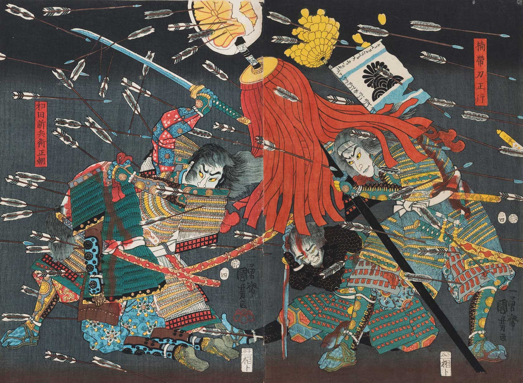 左方から雨あられと降り注ぐ矢。終わることのないその攻撃を刀で振り払う和田正朝。左手は力尽きた仲間の肩をむんずと掴み、その体を盾代わりに使う。しかし、和田の奮闘むなしく、大将、正行にはすでに5本の矢が・・・