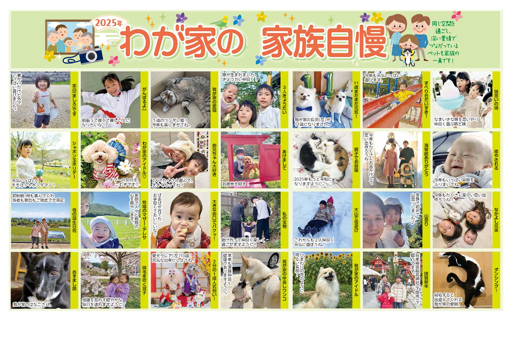 にっこり笑顔やほっとする瞬間など、お子さん、ご家族、友達同士、ペットとの日常の一枚をお寄せください。写真が掲載された紙面は、新年の思い出として残ります! 笑顔いっぱいの紙面づくりに、ぜひご参加ください。