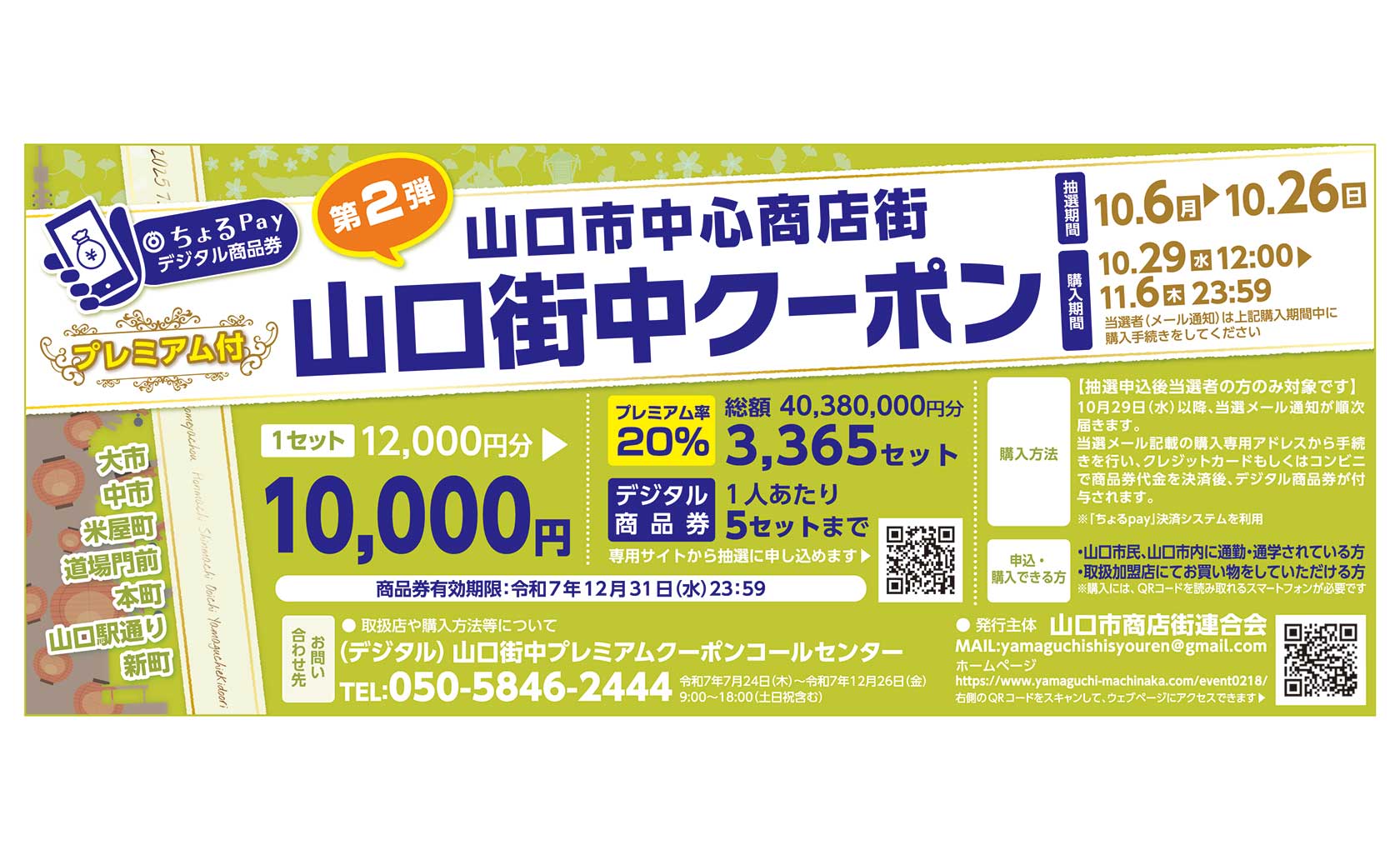 1セット12,000円分を10,000円で購入 対象は山口市民、山口市内に通勤・通学されている方