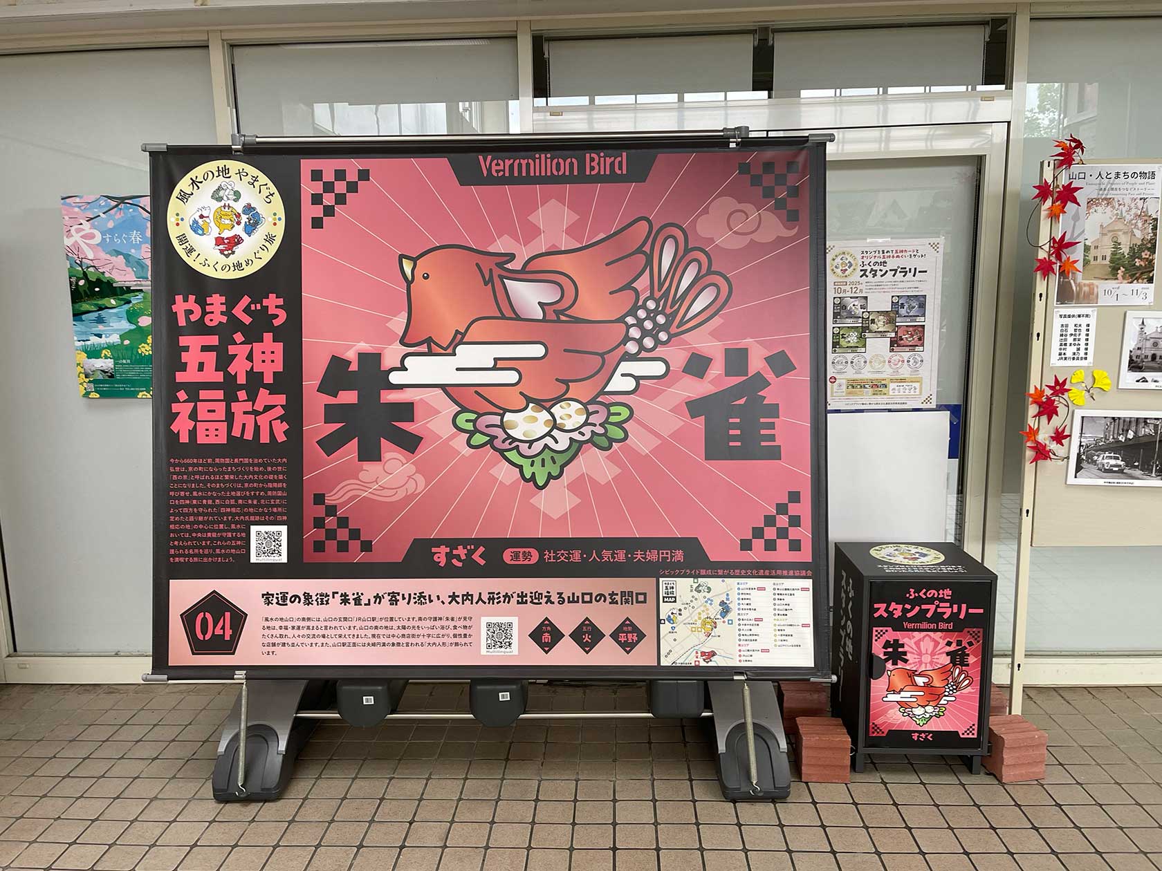 その逸話を観光誘客などに生かそうと、同協議会は今年、東西南北と中央の5カ所に観光看板を設置。場所は、山口市菜香亭(東・青龍)、狐の足あと(西・白狐)、JR山口駅(南・朱雀)、香山公園観光案内所(北・玄武)、山口ふるさと伝承総合センター(中央・黄龍)だ。スタンプラリーは、これらを周遊してもらおうと企画された。
