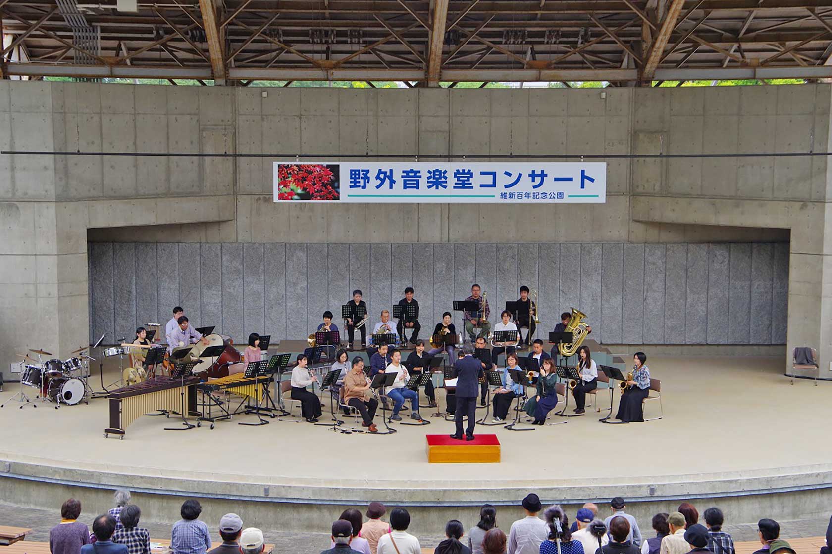 市民吹奏楽団「山口ブラスソサエティ」が出演する「ビッグシェル演奏会」が、11月3日(月・祝)午後2時半から、維新百年記念公園(山口市維新公園3)野外音楽堂(ビッグシェル)で開かれる。入場無料。
