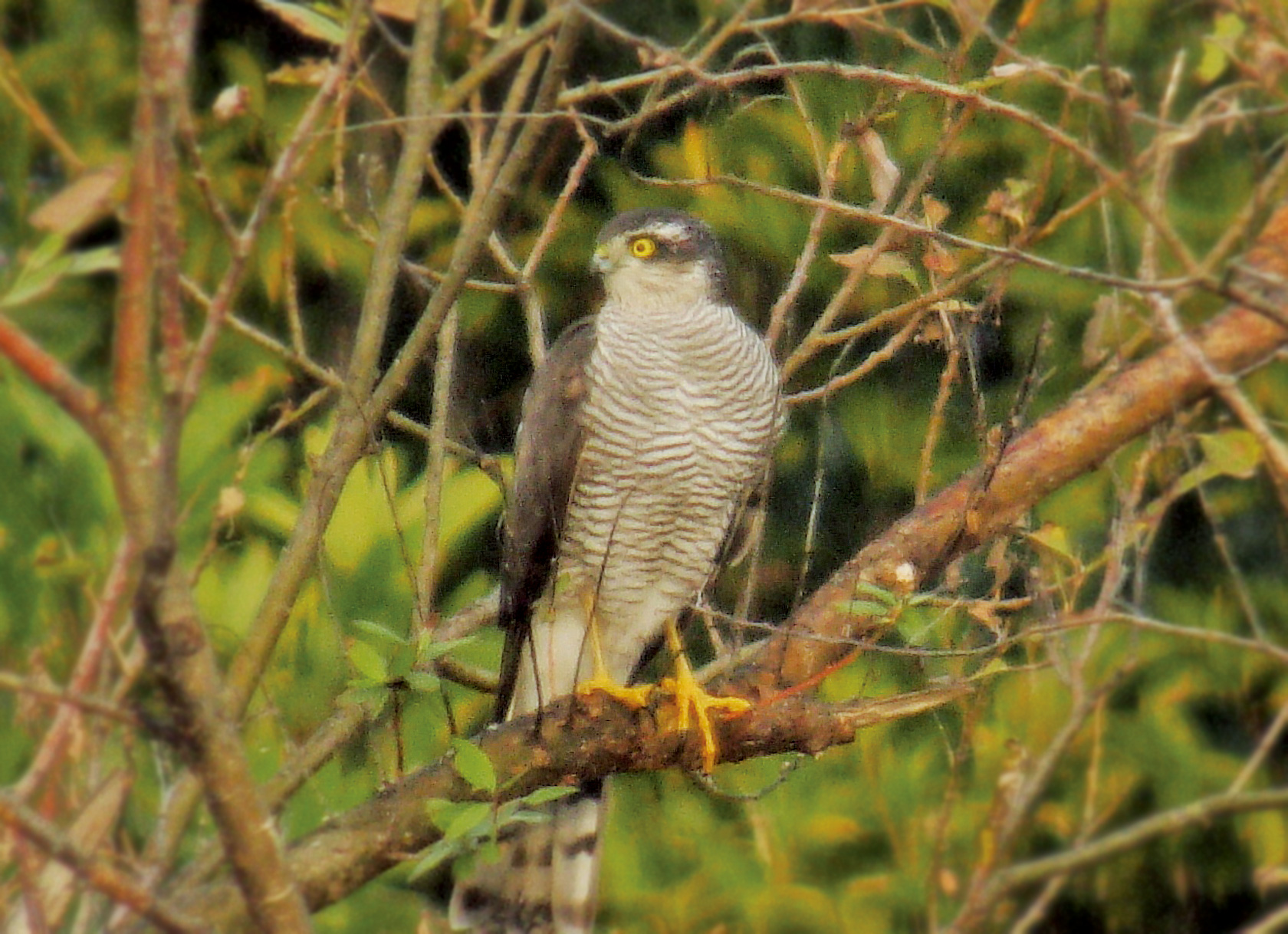 ハイタカはハトくらいの大きさで、小型の猛禽類です。野鳥をエサとし、スズメからツグミほどのサイズの小鳥類を捕食します。採餌などで油断している小鳥を狙って、羽ばたきと滑翔を繰り返しながら猛スピードで近づき、鋭い爪を持った足で捕らえます。