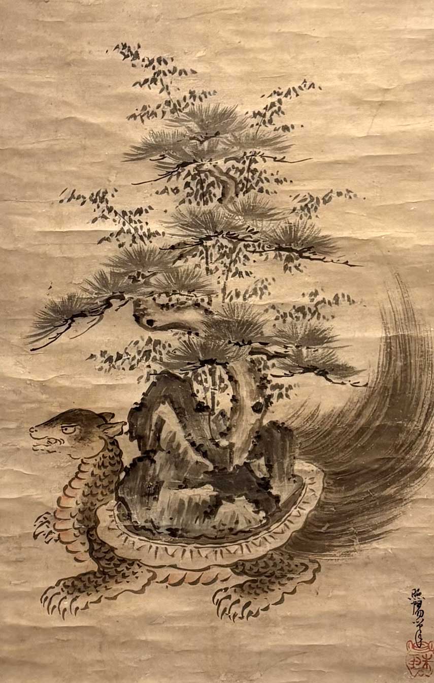 つまりこれは、亀の上に載せられたただの盆栽ではなく、日本人にとってはこの上もなくありがたい画題なのです。