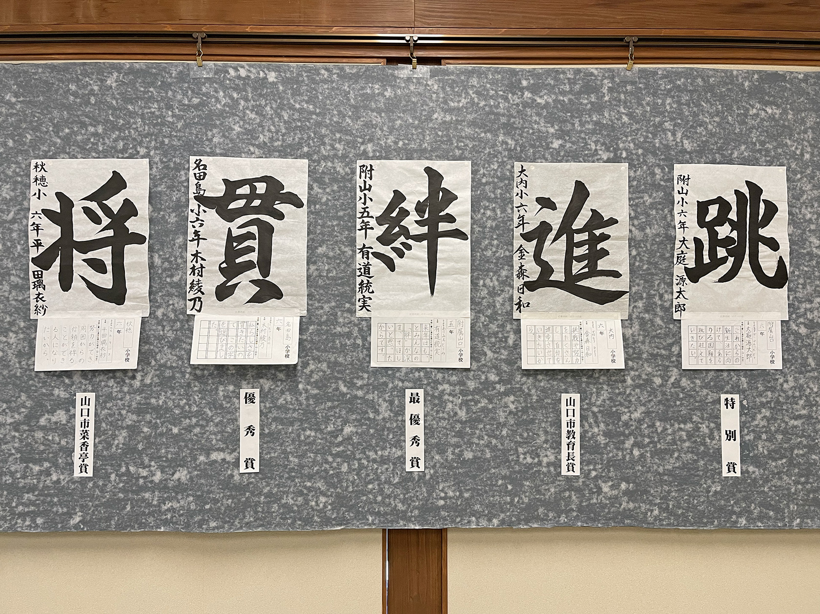 最優秀賞に輝いたのは、有道統実さん(附属山口小5年)による「絆」の字。「来年はもっとみんなの絆が深まってほしいと思ったから」との願いを込めたという。続く優秀賞には木村綾乃さん(名田島小6年)の「貫」、山口市教育長賞には金森日和さん(大内小6年)の「進」、山口市菜香亭賞には平田璃衣紗さん(秋穂小6年)の「将」、特別賞には大庭源太郎さん(附属山口小6年)の「跳」が選ばれた。