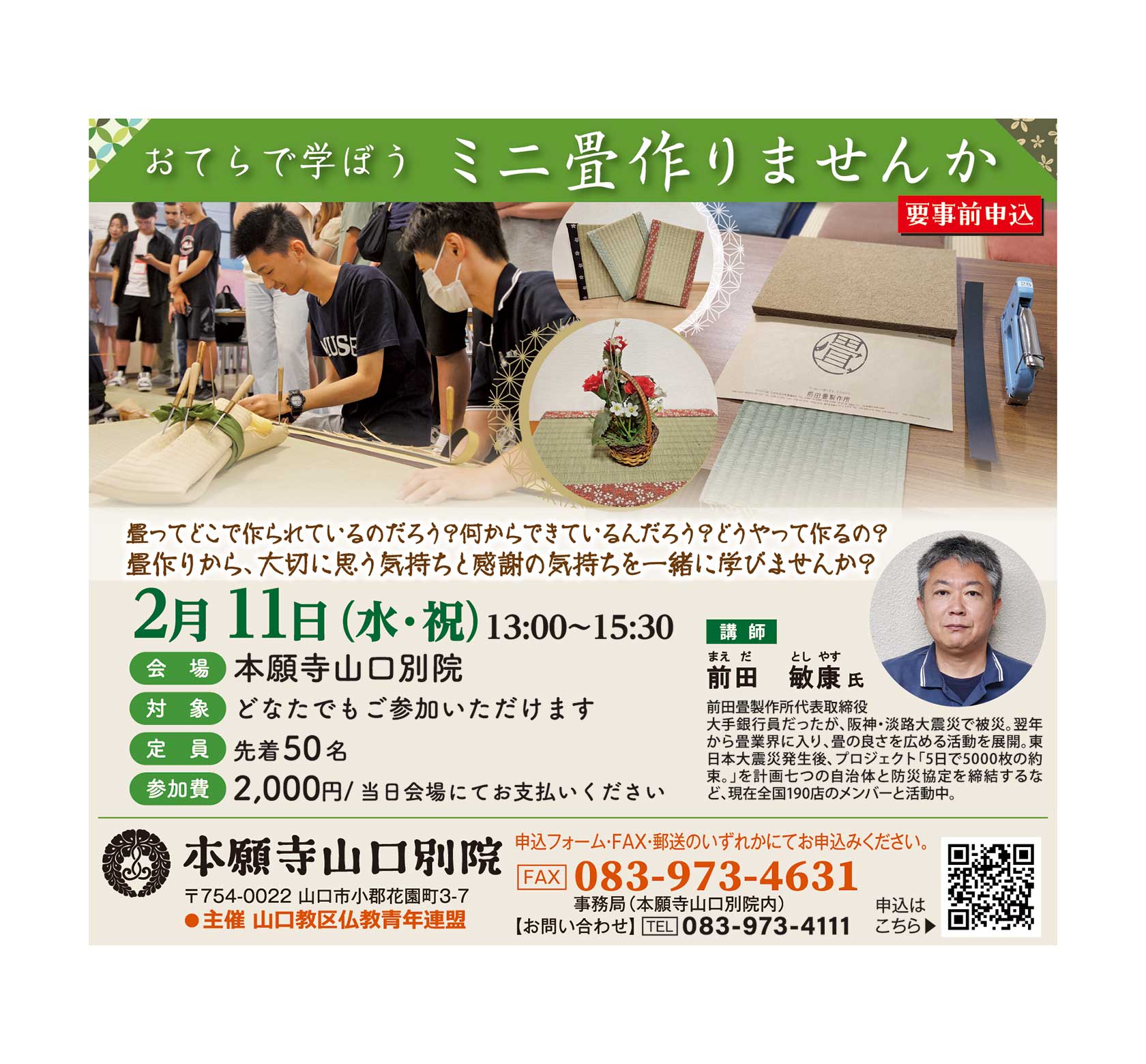 日時:2月11日(水・祝)13:00~15:30 会場:本願寺山口別院(山口市小郡花園町3-7) 定員:先着50名 参加費:2,000円