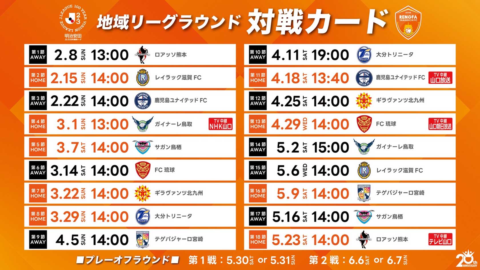 レノファ山口FCが戦うJ2・J3百年構想リーグ地域リーグラウンドの試合日程が発表されました。
