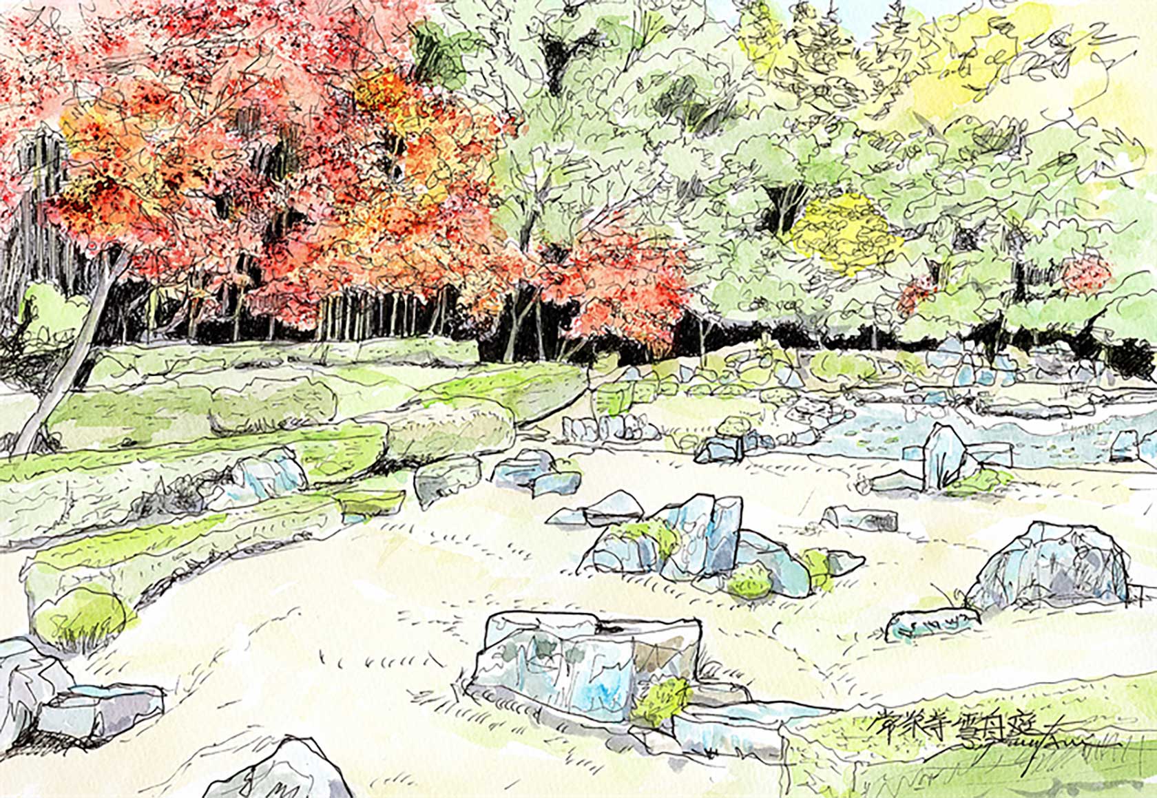 その作品が6点も国宝に選ばれている画聖・雪舟こそは、大内文化の大立役者と言っても過言ではないだろう。しかも、その多くは山口滞在中、大内氏から与えられたアトリエ・雲谷庵で描かれたと言われている。そして、彼の作と伝わる雪舟庭も、彼の作風である画禅一致を体現する水墨画、例えば毛利博物館所蔵の「四季山水図」を見るようで、明で本格的に水墨画を学んだ彼ならではの傑作だと言えよう。庭の造りは、中央に池を設けた池泉回遊式庭園で、手前に枯山水、その背後に心字池、その奥に渓谷や枯滝を配しており、常栄寺本堂から、また池沿いの園路からの眺めは、どこをとっても見事としか言いようがない。