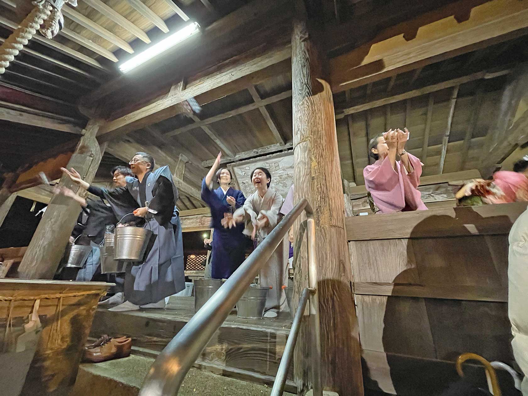 殿前の石段には、チガヤで作った輪にオニカズラを巻き付けた輪「すがぬけの輪」が設置されており、八の字にくぐることで、罪やけがれを払い清め、立春を迎えることができるという。そして、年男・年女による豆まきともちまきは午後7時からの祭典後。追儺役は次の皆さん。