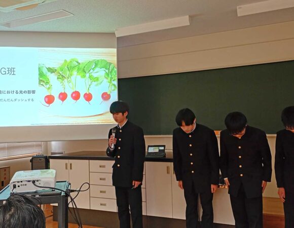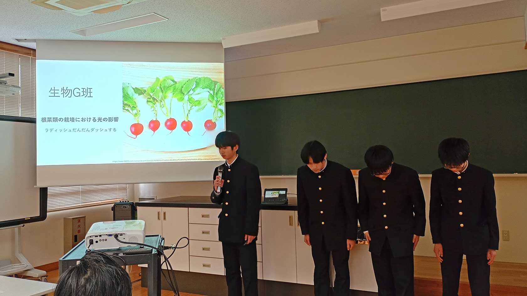 梅田憲和校長のあいさつ等に続き、9時10分から10時50分まで、理数科生徒によるステージ発表。1月28日の校内選考会において、15テーマの中から今回発表される6テーマが選出された。内容は次の通り。