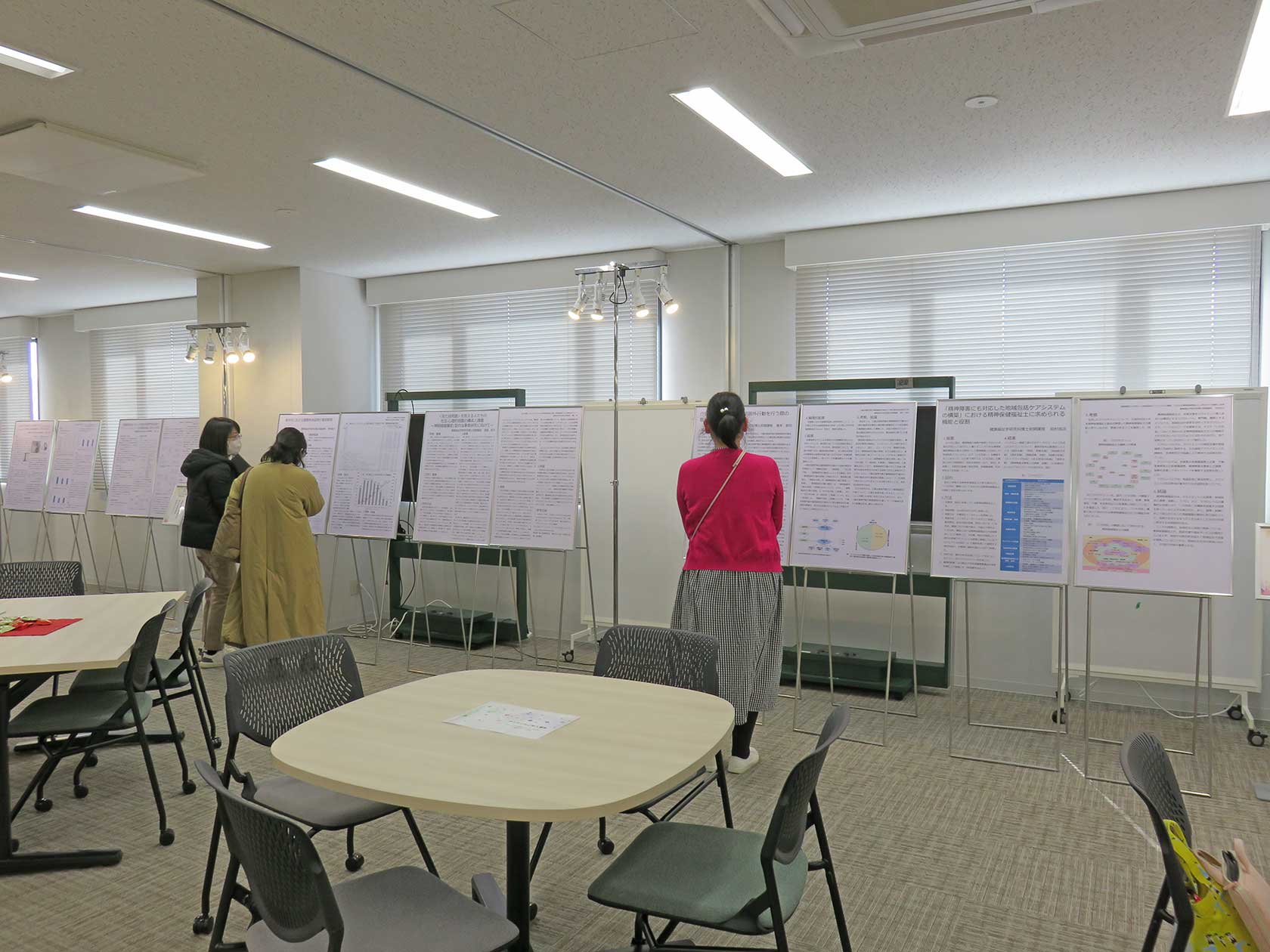 国際文化学研究科と健康福祉学研究科で学んだ16人と3グループによる、研究論文ポスター発表会。自身の研究成果をわかりやすく社会に発信することで、市民との交流や研究のさらなる発展につながることを目指している。同大に大学院が設置されたのは1999年度で、発表会は今回で13回目となる。