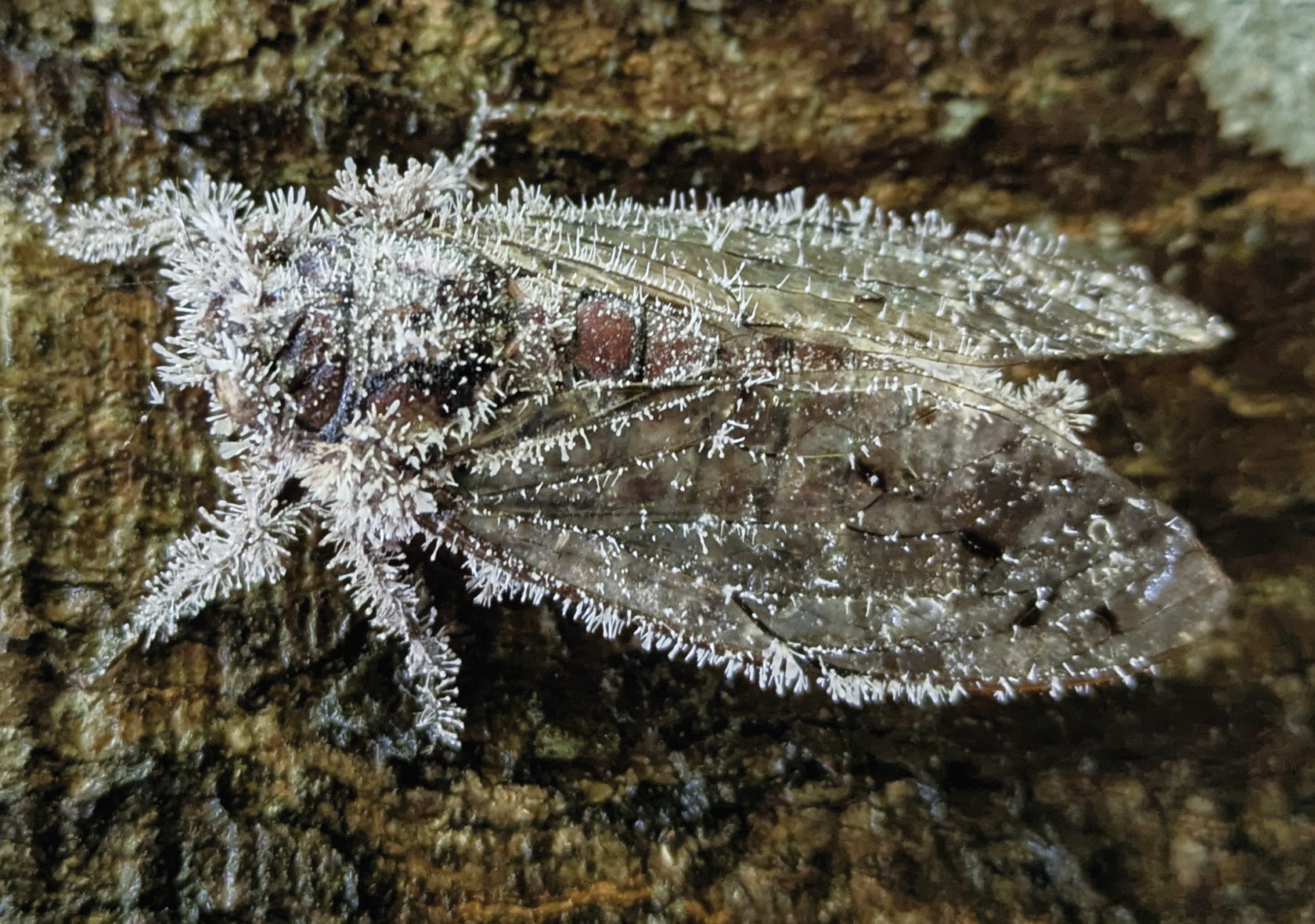 これはセミノハリセンボンという菌類に寄生されたセミを撮ったものです。冬虫夏草の一種で、無数の白い針状の子実体(しじつたい)が体中から生えることから、〝ハリセンボン〟の名がつきました。この菌類は無性生殖で増殖するとされ、子実体から環境中に分生子が放出され、次の宿主となるセミの体表面に付着します。宿主の体組織を栄養源として増殖し、宿主が死んだあと、再び無数の針状の子実体を形成します。