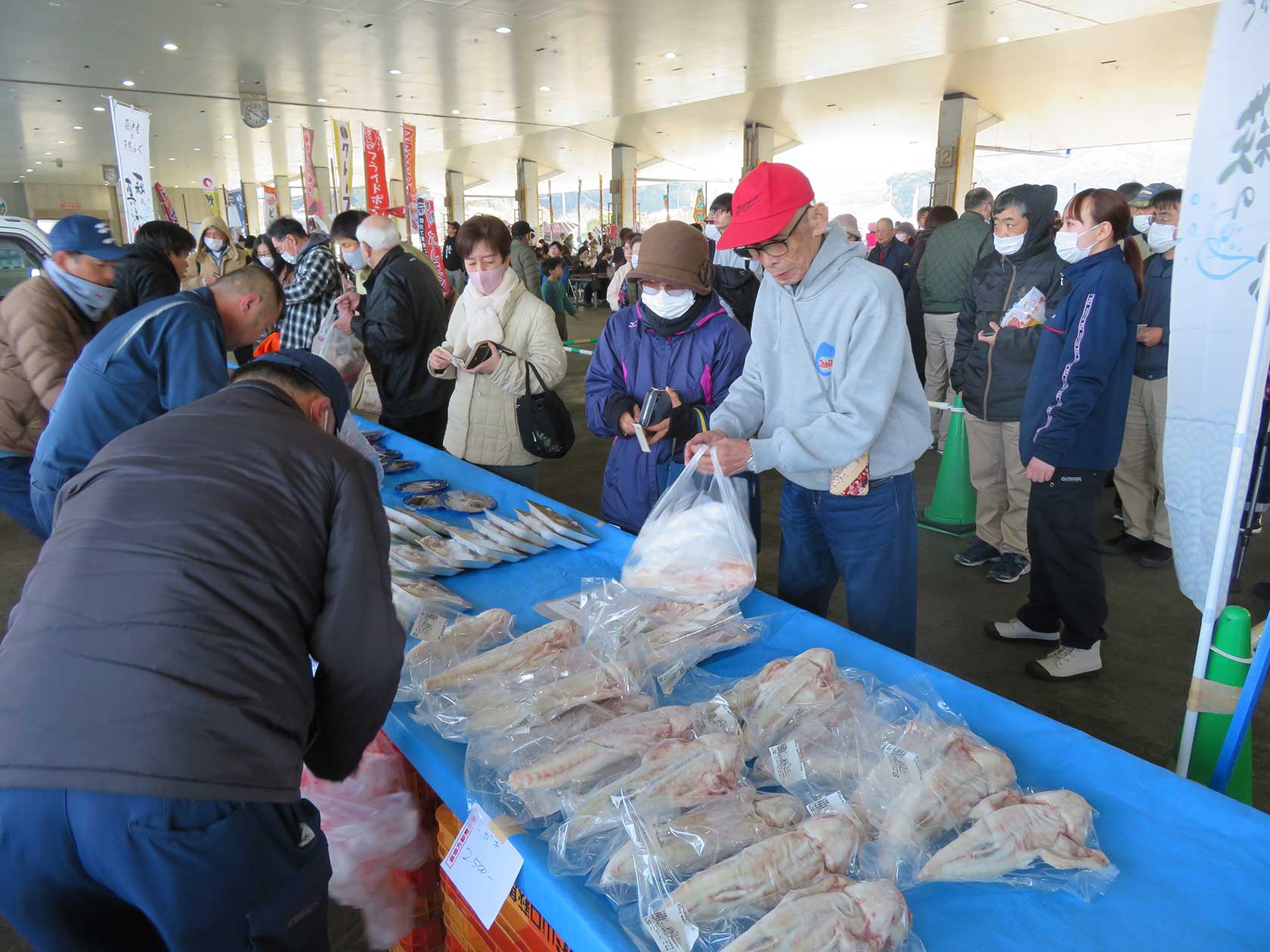 真ふぐ鍋(700食限定)と炊き込みご飯(同500食)はオープニングとともに500円で販売。真フグの刺し身・みがき(身欠き)・ぶつ切りの特売は午前10時15分にスタート。「真ふぐの握り寿司」(同100食)は、正午から購入できる。さらに、3匹の重さを当てる「真ふぐ重量あてクイズ」(参加は正午ごろまで)やビンゴ大会(ビンゴカードは午前11時半から配布、先着200枚)、「ふぐ活魚水槽展示」などの催しがある。