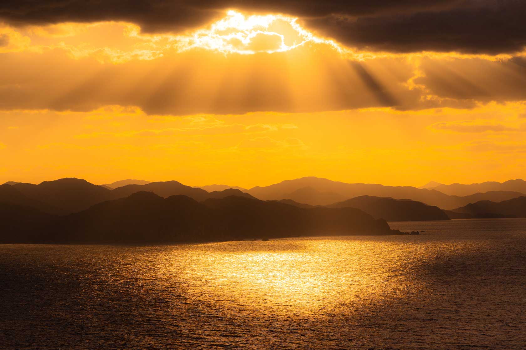 雲間から漏れ出た光が、展望台から臨む萩の海を照らしています。「ヤコブの梯子」とも呼ばれる光芒は、まるで宗教画のような美しさで、本当に天使が舞い降りて来そうな幻想的な雰囲気でした。