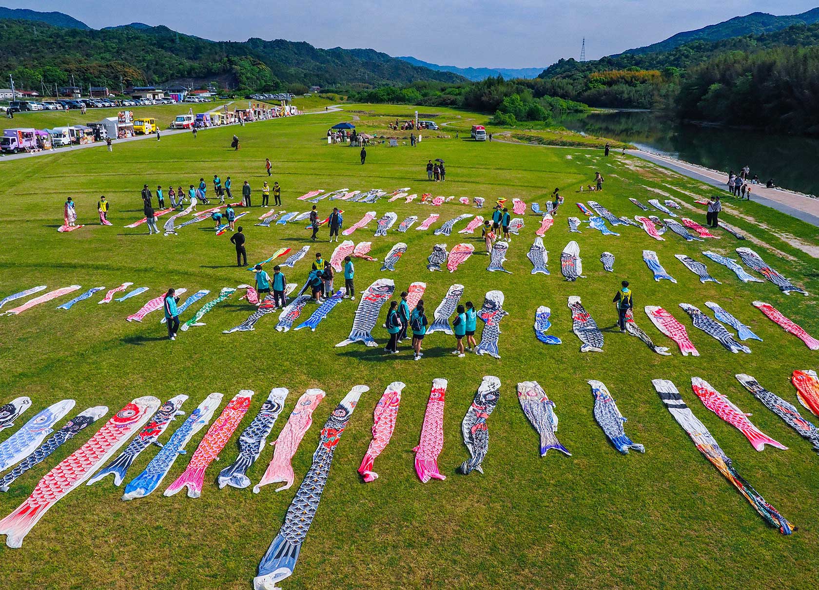防府市の佐波川で行われる鯉流しの準備をしているところです。色合いや大きさを陸上で確認して川に流すそうです。